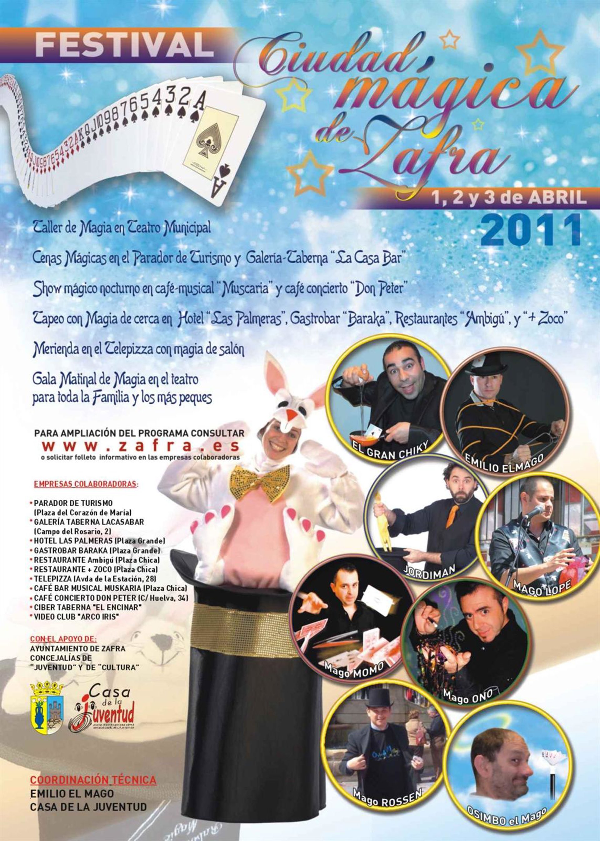El Parador de Turismo de Zafra, Muskaria, Café Concierto Don Peter, Zoco, Ambigú, Hotel Las Palmeras, Telepizza, Baraka y La Casa Bar, son los establecimientos que participan en este I Festival de Magia 'Ciudad de Zafra'.