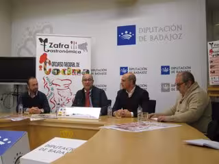 El diputado-delegado de los patronatos provinciales de Turismo y Tauromaquia de Badajoz, Lorenzo Molina, acompañado del alcalde de Zafra, José Carlos Contreras, y los cocineros Juan Luis Rodríguez y Leo Carvajal, han presentado en la institución provincial pacense este festival en el que también se darán cita 14 establecimientos de la localidad, que ofrecerán tapas y raciones a base de cordero Corderex o torta de Barros.
