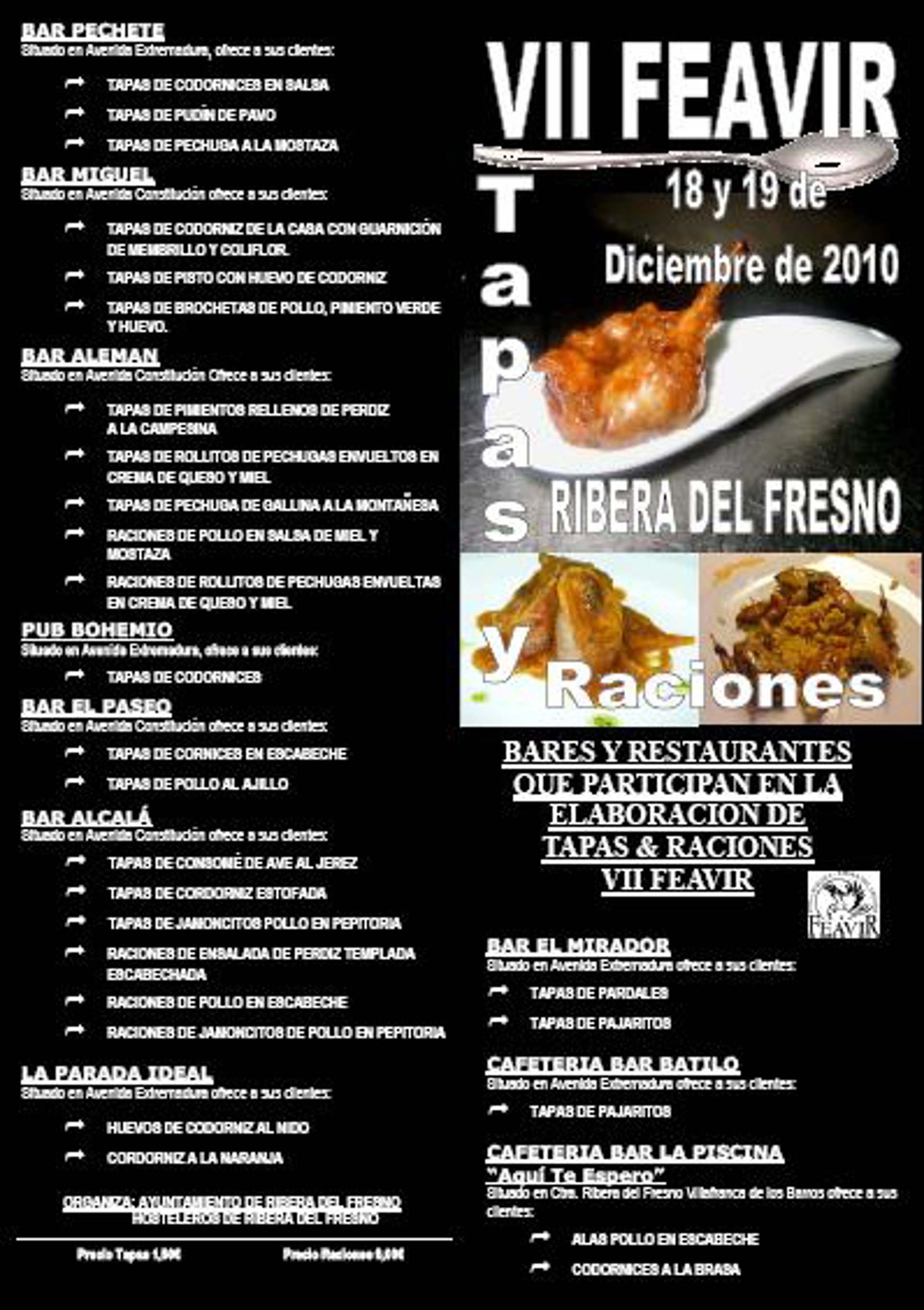 Como novedad, esta edición incluirá una degustación de tapas y raciones elaboradas con diferentes aves, por parte de bares y restaurantes de la localidad, los días 18 y 19 de diciembre, organizada por el Ayuntamiento de Ribera del Fresno y diversos empresarios hosteleros.