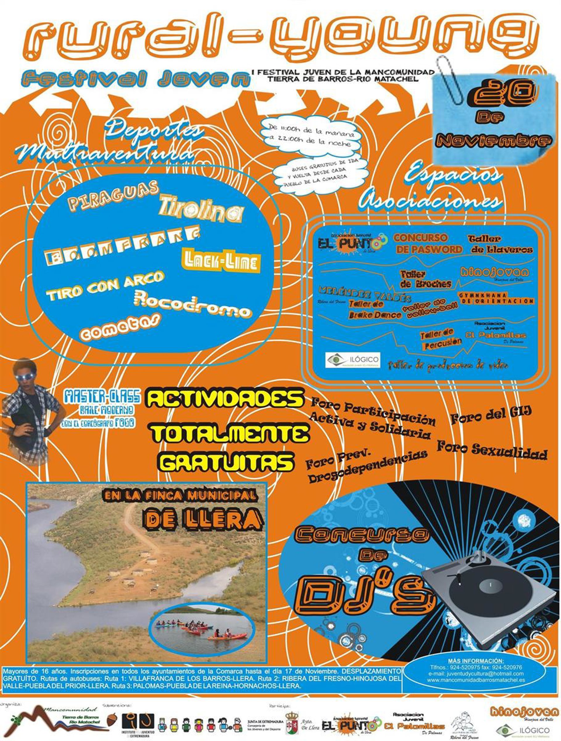 El I Festival Juvenil 'Rural Young' de la Mancomunidad Tierra de Barros - Río Matachel (Badajoz), se celebrará este sábado, 20 de noviembre, entre las 11,00 horas y las 22,00 horas, en el pantano de 'Los Molinos' de la finca municipal 'Las Mil y Quinientas' de Llera.