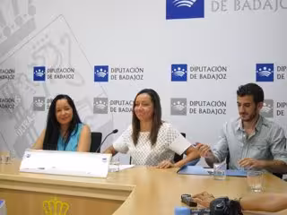 La alcaldesa de Jerez de los Caballeros, Virginia Borrallo, acompañada de la concejala de Festejos y Cultura de la localidad, María Ángeles Sánchez, y el director de la obra, Juan Manuel Delgado, ha presentado en la Diputación de Badajoz esta fiesta que recreará el pasado templario de Jerez del 9 al 12 de julio.