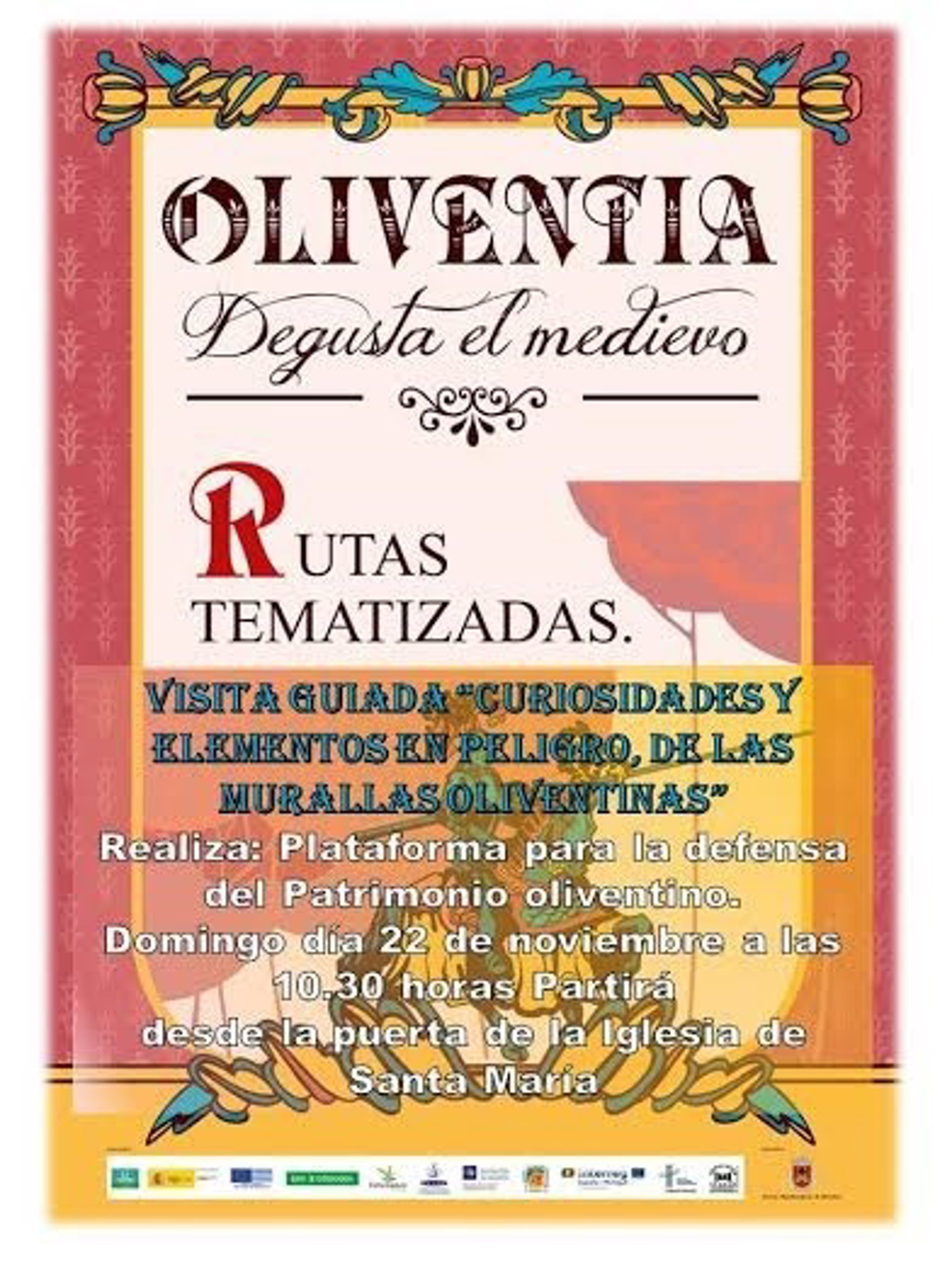 También el domingo la programación de 'Oliventia, degusta el Medievo' propone una ruta tematizada, una visita guiada que lleva por título 'Curiosidades y elementos en peligro de las murallas oliventinas' organizada por la Plataforma para la defensa del Patrimonio oliventino y que comenzará a las 10,30 horas con la puerta de la Iglesia de Santa María como punto de encuentro.
