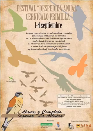 Extremadura despedirá hasta el año que viene al cernícalo primilla, una de las especies de aves migratorias "más emblemáticas" de la región, con un festival del 1 al 4 de septiembre en el espacio protegido de Llanos y Complejo Lagunar de La Albuera (Badajoz).