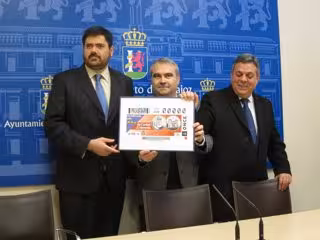 El alcalde de Badajoz, Francisco Javier Fragoso, junto con el delegado territorial de la ONCE en Extremadura, Fernando Iglesias, y el presidente del Consejo Territorial en la región, Francisco Javier Olivera, han presentado este cupón correspondiente al día 10 de febrero y a la serie 'Tu ciudad en una moneda' y en el que se muestra la citada moneda de 5 euros de valor y que forma parte, a su vez, de una serie de monedas conmemorativas de capitales de provincia.