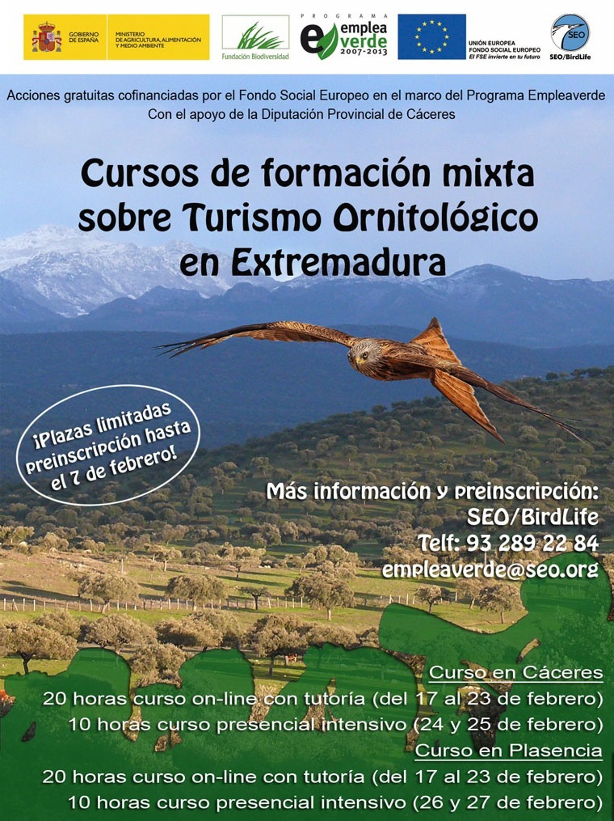 La organización SEO/BirdLife impartirá en Cáceres y en Plasencia durante este mes de febrero cursos on-line y presenciales sobre turismo ornitológico, dirigidos a profesionales del sector turístico en Extremadura.