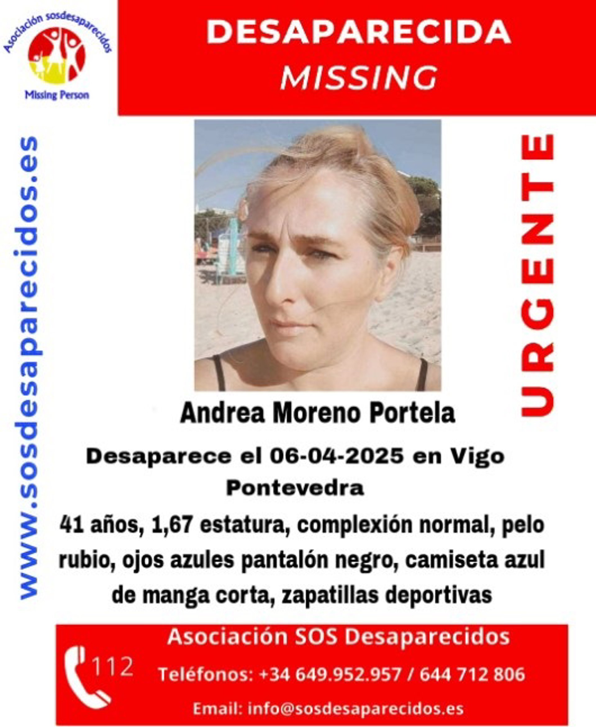 A familia de Andrea denunciou en Comisaría a súa desaparición e o grupo 2 da UDEV fíxose cargo da investigación. No momento da desaparición, a muller, de 1,67 m de estatura, pelo louro e ollos azuis, vestía pantalón negro, camiseta azul de manga curta e zapatillas deportivas.