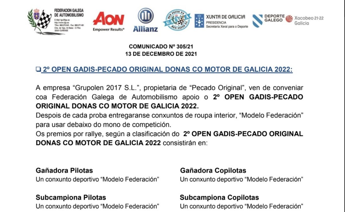 Ademais, o grupo de traballo RenovaFGA esixiu publicamente ao presidente da Federación Galega de Automobilismo (FGA), Iván Corral, a "inmediata retirada" destes premios e as "desculpas pertinentes" por unha promoción "machista e anacrónica" que consiste en entregar aos ás participantes no "Open Gadis- Pecado Orixinal Doas co Motor de Galicia 2022" conxuntos de roupa interior.