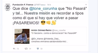 A Fundación Francisco Franco replicou vía Twitter ao portavoz de En Marea no Congreso, Antón Gómez-Reino, quen este xoves, durante un debate na Cámara Baixa, lembrou o berro antifascista de 'Non pasarán': "Se hai que volver pasar Pasaremos!".