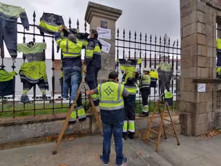 Os operarios da empresa ElectroRayma, con domicilio en Narón (A Coruña), colgaron a súa roupa de traballo do peche exterior de Navantia nunha acción de protesta para reclamar solucións.