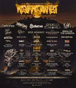 O Resurrection Fest de 2022 celebrarase entre o 29 de xuño e o 3 de xullo do próximo ano. Avenged Sevenfold (data única en España e unha das poucas actuacións en Europa o ano que vén), Korn (único festival en España), Judas Priest - 50 years (celebrando os seus 50 anos como un dos referentes do heavy metal), Deftones e Sabaton (coa maior produción que tiveron nunca en España) serán os encargados de encabezar cada un do cinco días de festival.