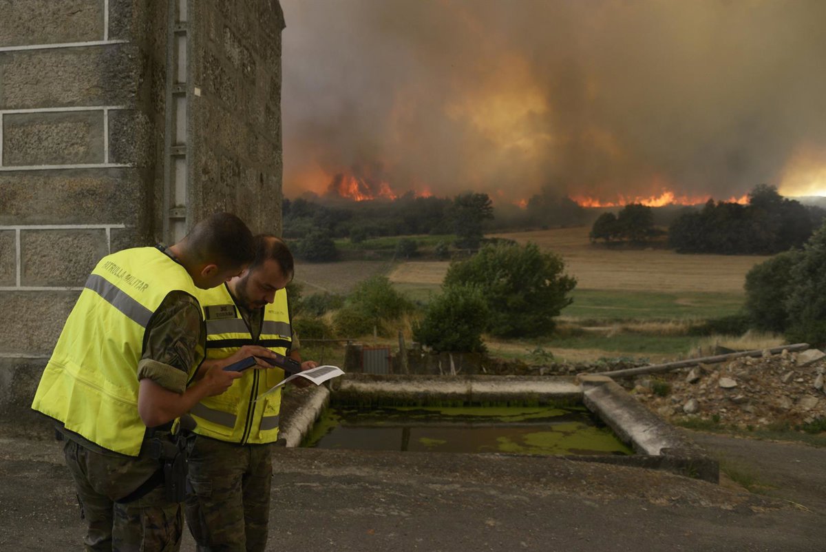 Vecinos y vecinas de Vilela, en Cualedro, mientras se acercan las llamas a la localidad - Rosa Veiga - Europa Press