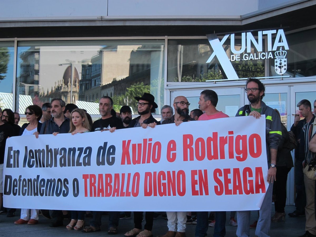 Brigadistas de la empresa pública Seaga se han concentrado este miércoles ante la sede de la Xunta en Vigo para denunciar la precariedad laboral en el servicio de extinción de incendios forestales, y la escasa inversión en prevención y cuidado de los montes.