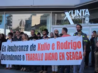 En la concentración han participado la madre de Rodrigo Amo y la hermana de Julio Martínez, quienes han mostrado su "decepción" e "indignación" por la sentencia del Tribunal Superior de Xustiza de Galicia (TSXG) en la que, pese a que se aumenta la indemnización que debe pagarles la Xunta por su parte de responsabilidad en la muerte de los operarios, también se señala la "responsabilidad culposa" de las propias víctimas.
