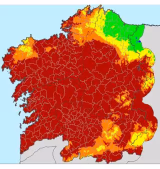Así figura en el índice de riesgo diario de incendio forestal, que actualiza el peligro existente en Galicia cada día. Toda la provincia de Pontevedra, así como casi toda la de A Coruña y Pontevedra están en riesgo extremo, al igual que la mitad sur de Lugo.