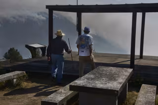 Varias personas observan el incendio desde el mirador de A Lampa en la aldea de Moura, a 19 de septiembre de 2025, en Nogueira de Ramuín, Ourense, Galicia (España). - Rosa Veiga - Europa Press