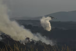 Un avión tira gaua sobre el fuego para extinguir el incendio, a 2 de agosto de 2025, en Vilardevós, Ourense, Galicia (España). El incendio declarado este sábado, 2 de agosto, en el municipio ourensano de Vilardevós continúa activo y ha calcinado ya 570 he - Rosa Veiga - Europa Press