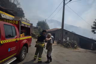 Un residente y un bombero después de la noche con el fuego alrededor de la aldea, a 10 de agosto de 2025, en Maceda, Ourense, Galicia (España). - Rosa Veiga - Europa Press