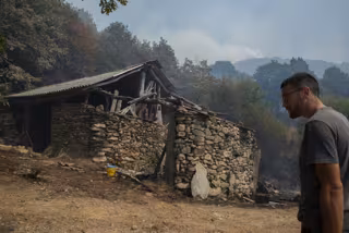 Ganadero propietario de algo más de cien vacas en Teixeira, intenta sofocar el fuego en uno de los refugios de los animales, a 10 de agosto de 2025, en Maceda, Ourense, Galicia (España). Un incendio en Maceda (Ourense), parroquia de Castro de Escuadro, ca - Rosa Veiga - Europa Press