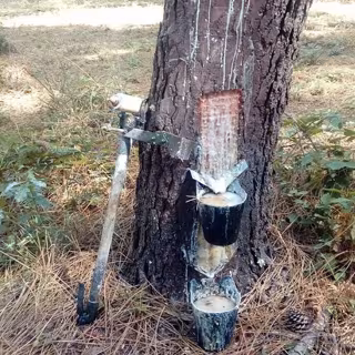 Posteriormente, en torno a marzo y abril, con la llegada del buen tiempo, se realizan las incisiones en los troncos cada 12 días, pero este año se retrasó por las lluvias. Tras ello, la recogida de la resina va de julio a octubre, aproximadamente.