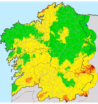 Además, varias zonas en el sur de la provincia ourensana, así como alguna zona oriental se encuentran en riesgo muy alto, incluso con ciertos puntos en riesgo extremo.
