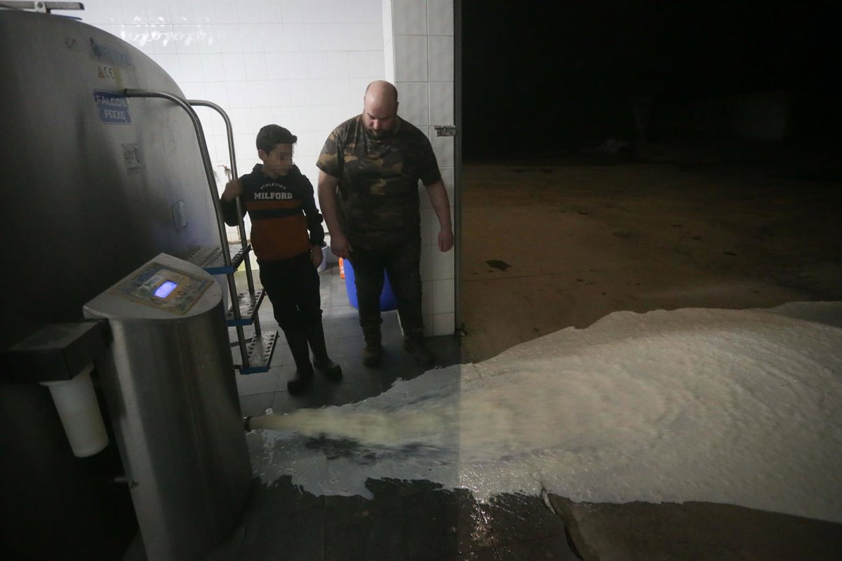 Un ganadero vierte la leche al suelo después de que la industria láctea tenga que parar su actividad a partir de hoy, a 17 de marzo de 2022, en Lugo, Galicia (España). - Carlos Castro - Europa Press
