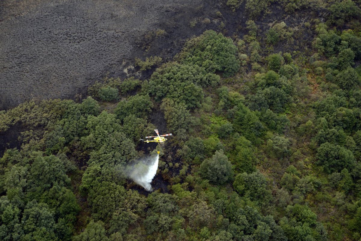 Un helicóptero trabaja en las labores de extinción del incendio en en Carballeda de Valdeorras (Ourense, Galicia) - Rosa Veiga - Europa Press