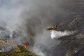 Un hidroavión realiza labores de extinción de un incendio forestal en la Serra do Leboreiro, en el parque natural de Baixa Limia e Serra do Xurés, a 26 de agosto de 2022, en Serra do Xurés, Ourense, Galicia (España). La superficie afectada por el incend - Rosa Veiga - Europa Press