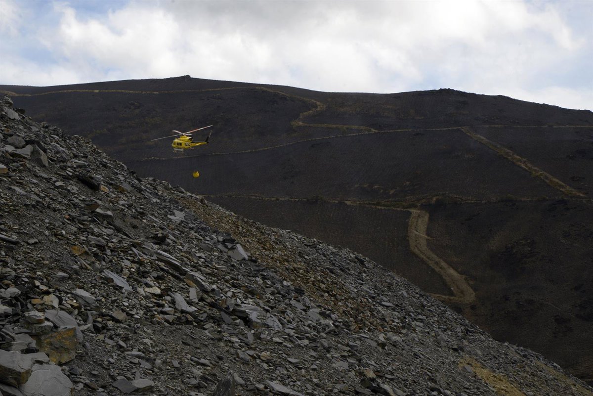 Un helicóptero trabaja en las labores de extinción del incendio, a 7 de septiembre de 2025, en Casaio, Ourense, Galicia (España). El incendio de Carballeda de Valdeorras, declarado en la tarde del sábado, 6 de septiembre, en la parroquia de Casaio, avanza - Rosa Veiga - Europa Press