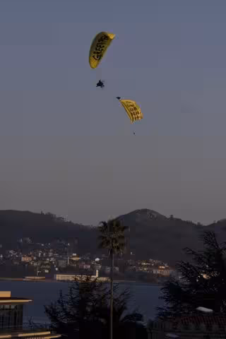 Así, los dos 'pilotos' sobrevolaron el hotel con dos parapentes amarillos con el logo de Greenpeace y dos pancartas con el lema en inglés 'UE. Save our seas' --'UE. Salvad nuestros mares'--.