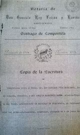 La escritura confirma que las piezas fueron adquiridas en 1948 por el Gobierno local e incluye una cláusula en la que el vendedor condiciona su adquisición a que las estatuas "permanezcan indefinidamente en patrimonio del excelentísimo Ayuntamiento de Santiago de Compostela", estableciendo una indemnización en caso de enajenación, donación o cesión de depósito.
