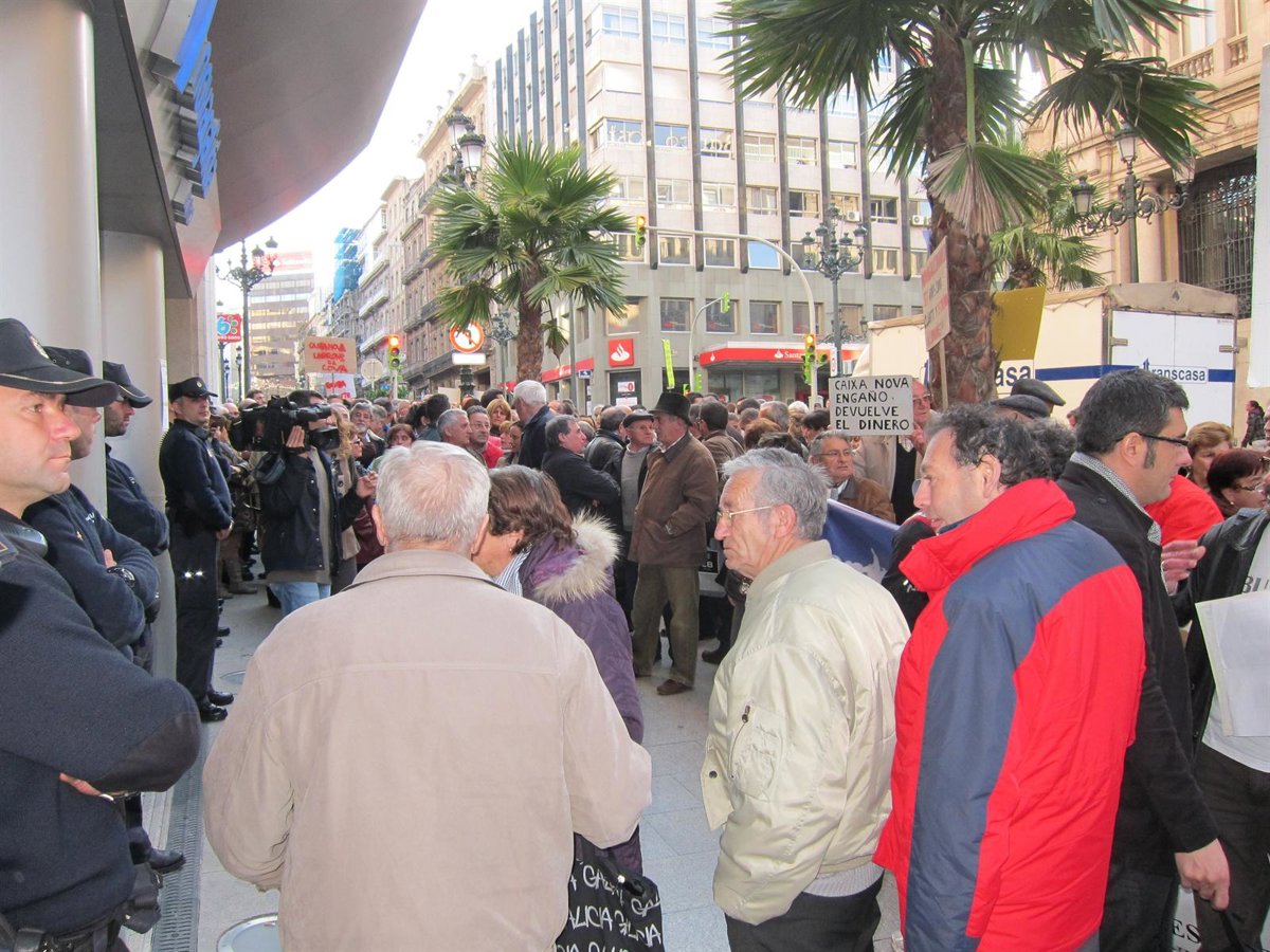 Unos 200 afectados por la adquisición de participaciones preferentes y subordinadas a Caixanova y Caixa Galicia, posteriomente Novacaixagalicia, se han concentrado este jueves ante la sede principal de la entidad en Vigo, en la que han intentado entrar a la fuerza, aunque un cordón policial se lo ha impedido.