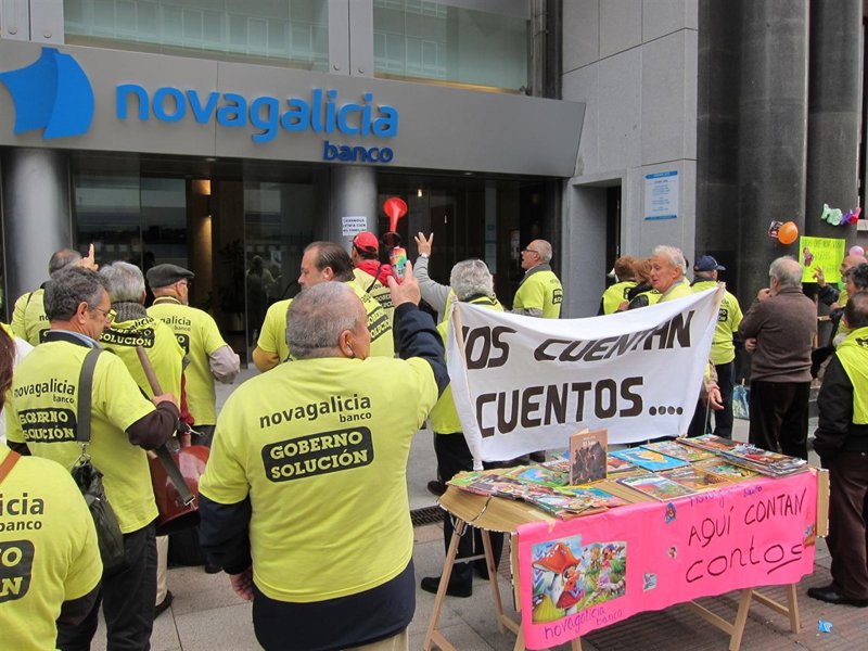 Afectados por las participaciones preferentes han entrado este lunes en la oficina central de Novagalicia Banco en la ciudad para "contar cuentos" al personal de la entidad que les atiende en sus gestiones, como forma simbólica de denunciar su situación y pedir la recuperación de sus ahorros para todos ellos.