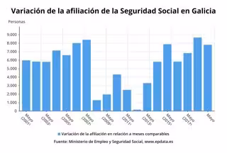 En relación con el mismo periodo de 2018, son 20.315 afiliaciones más en la comunidad gallega, lo que representa un incremento del 2,04%. Ambas variaciones son ligeramente inferiores a la de la media (1,10% y 2,78%, respectivamente).