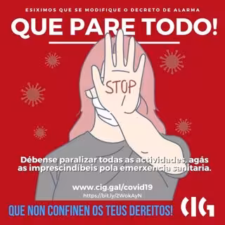 Por su parte, la CIG es el sindicato que de forma más clara exige que se modifique el decreto de estado de alarma aprobado por el Gobierno para que "pare todo", más allá de lo esencial, y que "la gente puede realmente quedarse en casa".