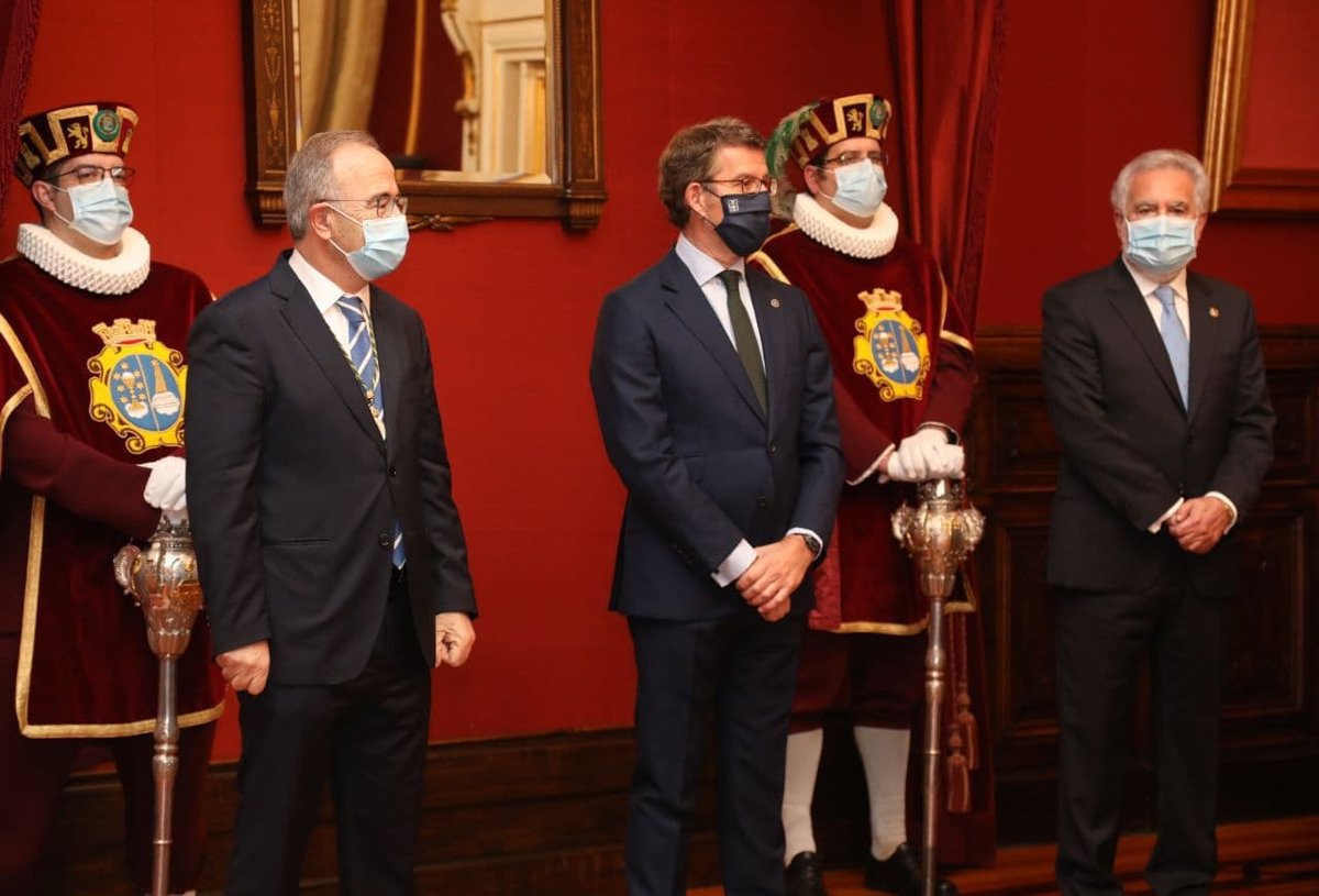 El alcalde de Santiago, Xosé Sánchez Bugallo, el presidente de la Xunta, Alberto Núñez Feijóo, y el presidente del Parlamento de Galicia, Miguel Ángel Santalices, en la Ofrenda de la Traslación de los restos del Apóstol Santiago de 2020. - AYUNTAMIENTO DE SANTIAGO
