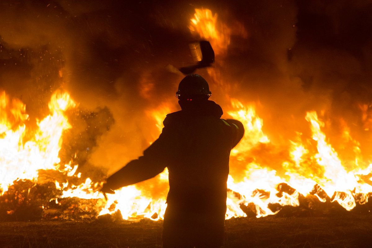 Un trabajador tira un elemento a una barricada durante un velatorio nocturno simbólico convocado por la fábrica de Alcoa.