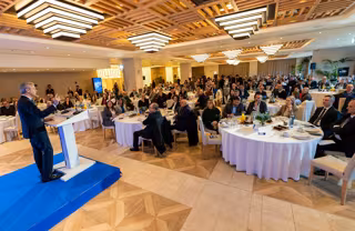 El candidato a la presidencia de la Xunta del PP, Alfonso Rueda, en un desayuno con agentes sociales y económicos en Vigo, a 12 de febrero de 2024. - PPDEG