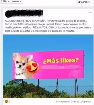 En este nuevo texto "que replica uno anterior", se añaden comentarios como "'alquiler de perros en A Coruña' y 'paseos controlados para adopción por dos euros', mientras que afirma que no existen denuncias y que esto responde a noticias falsas".