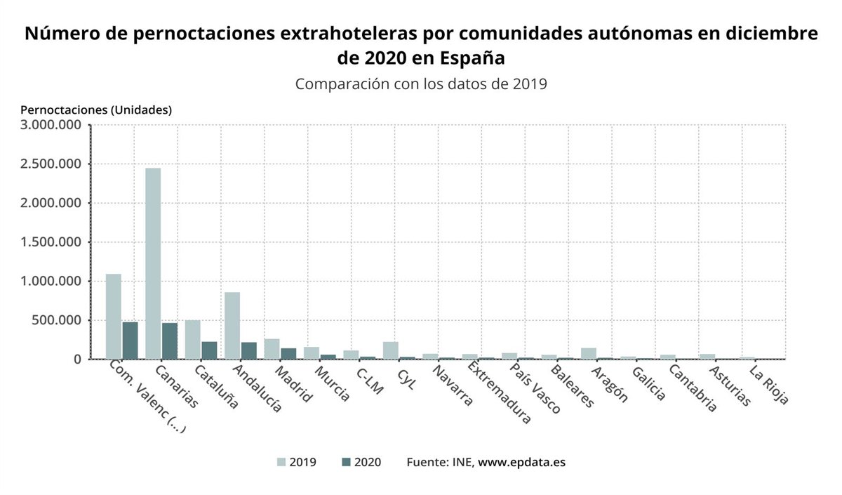 Sin embargo, la situación fue muy distinta según el tipo de alojamiento y fueron los apartamentos los que mejor resistieron la crisis de la covid-19 en último mes de 2020, con un descenso en la cifra de viajeros del 69% y una bajada de solo el 26,5% de sus pernoctaciones con respecto a diciembre de 2019.