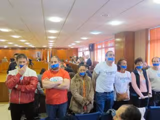 Entre los asistentes al pleno, algunas personas han portado pancartas para denunciar la "ley mordaza" defendida por el gobierno municipal, y otras tapaban sus bocas con cinta para denunciar la supuesta reducción de la libertad de expresión.