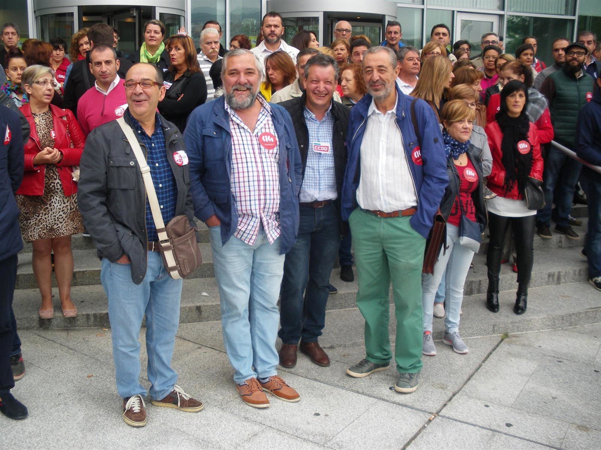 Una amplia representación de los sindicatos UGT, CIG y CC.OO. se han concentrado en la mañana de este jueves a las puertas de los juzgados de Ourense en apoyo a los investigados.