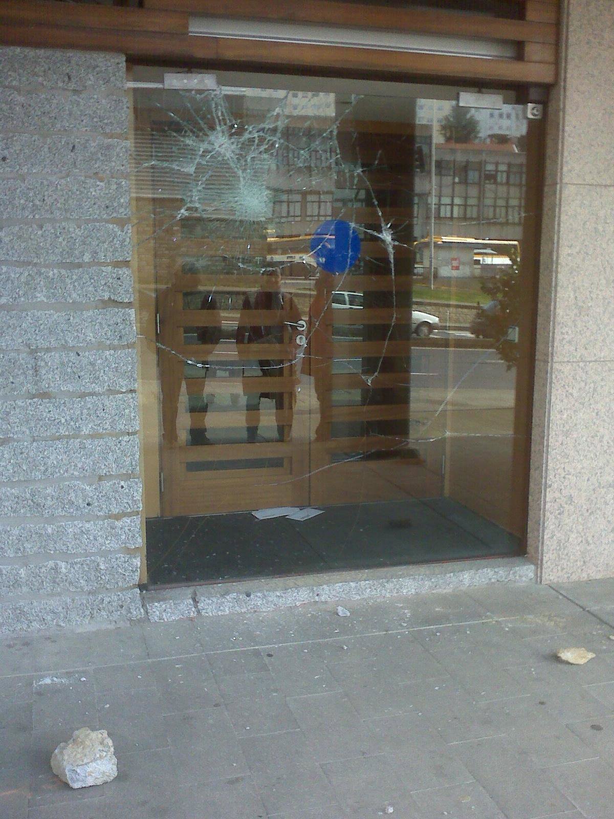 Personas desconocidas perpetraron un ataque con piedras de gran tamaño contra la cristalera de entrada de la sede del Bloque Nacionalista Galego (BNG), en Santiago de Compostela.