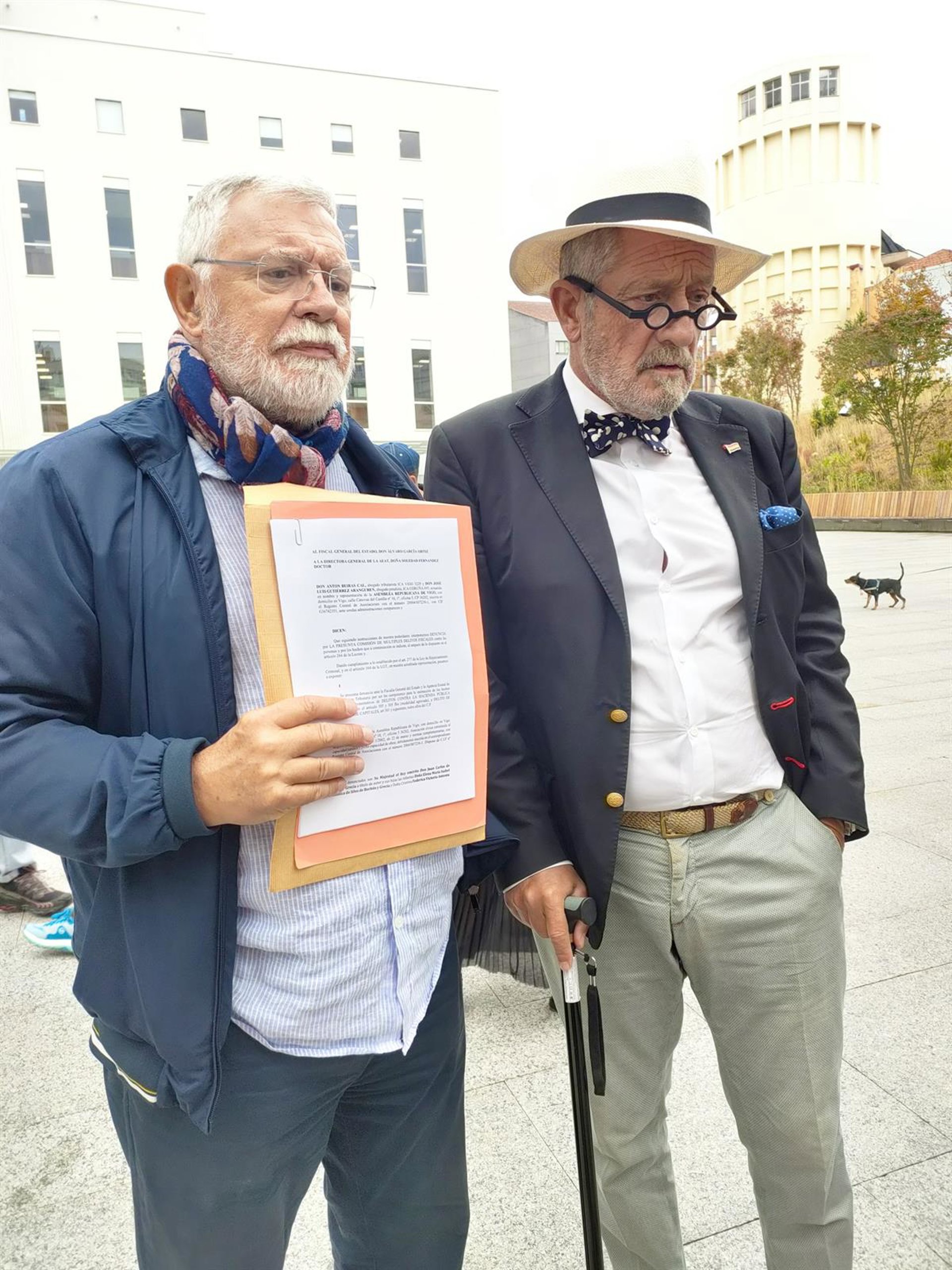 El presidente de la Asamblea Republicana de Vigo, Celso Pazos, y el abogado Antón Beiras Cal, ante la Ciudad de la Justicia de Vigo, antes de presentar ante Fiscalía una denuncia contra el Rey emérito y las Infantas por fraude fiscal y blanqueo. - EUROPA PRESS