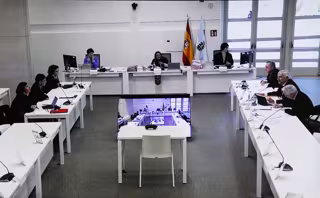 Una captura de pantalla de televisión instalada en la sala de prensa de la parte civil del juicio del accidente ferroviario del Alvia, en la Ciudade de Justicia, a 14 de febrero de 2023, en Santiago de Compostela, A Coruña (España). El juicio del Alvia - Álvaro Ballesteros - Europa Press