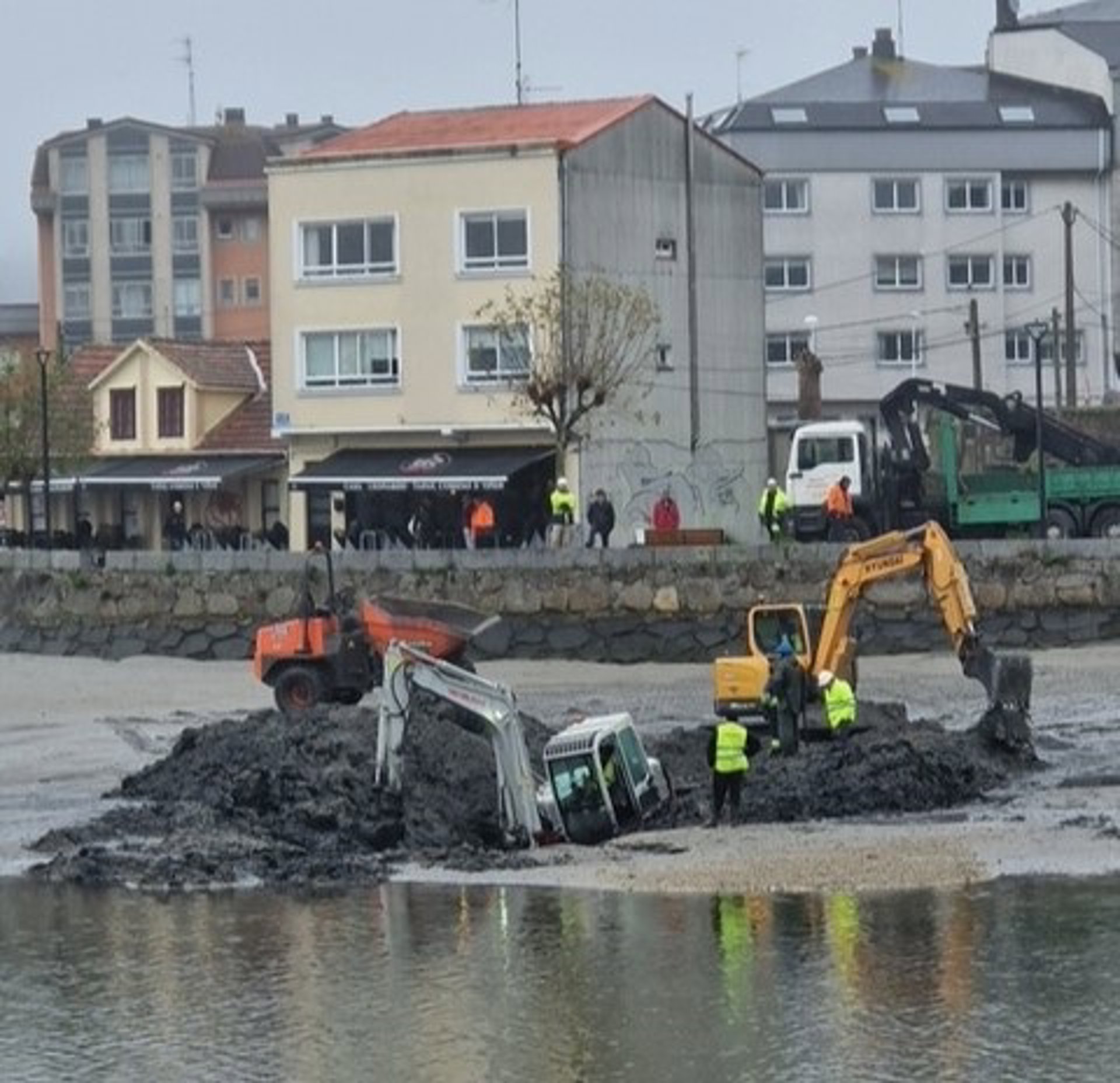 Una de las máquinas que trabaja en el dragado de la ría de O Burgo tuvo que ser auxiliada por otra al quedar parcialmente atrapada en la arena durante los trabajos de saneamiento.