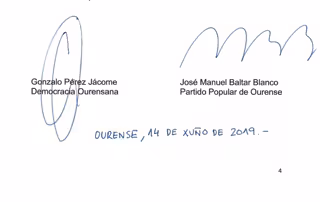 Democracia Ourensana (DO) ha suscrito en la tarde de este viernes un acuerdo con el PP para que Gonzalo Pérez Jácome sea investido alcalde del Ayuntamiento de Ourense con los votos de los populares. A cambio, los dos escaños de DO en la Diputación permitirán que José Manuel Baltar continúe al frente del gobierno provincial.