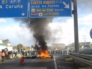 Más de 2.000 trabajadores de Navantia Ferrol y de empresas auxiliares cortan el tráfico en la autopista AP-9 en dirección a Ferrol y A Coruña con barricadas de neumáticos ardiendo, en la que constituye una nueva protesta para reclamar carga de trabajo ante la ausencia de nuevos contratos.