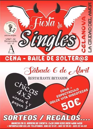Cartel de la 'Fiesta de Singles' que se organiza en Celanova (Ourense) para el día 6 de abril - 'FIESTA DE SINGLES'