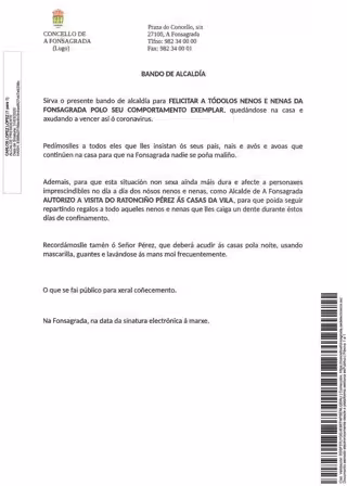 El Ayuntamiento de A Fonsagrada (Lugo) ha emitido un bando por el cual autoriza al Ratoncito Pérez a visitar las casas de los niños y niñas del municipio, siempre y cuando utilice guantes y mascarilla y se lave las manos frecuentemente.