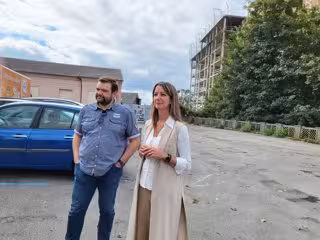 La alcaldesa, Lara Méndez, acompañada del concejal de Urbanismo, Álvaro Santos, ha comparecido este martes en rueda de prensa en las inmediaciones del "esqueleto" urbanístico de dicha edificación.